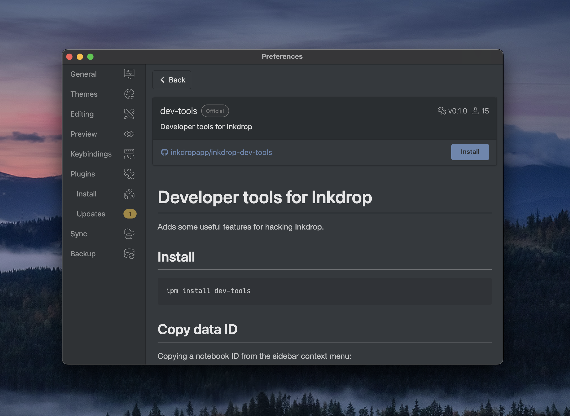Here, you need an ID of the notebook that you want to export. To get the notebook ID easily, install the dev-tools plugin from Preferences → Plugins/Install.