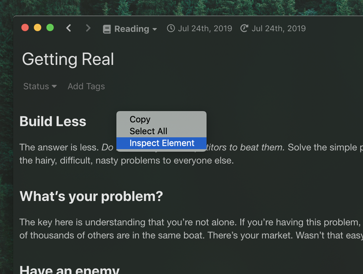 First, open a note in a notebook which you would like to add custom highlightings ("Reading" in this example). Then, right-click on the preview pane and select "Inspect Element".